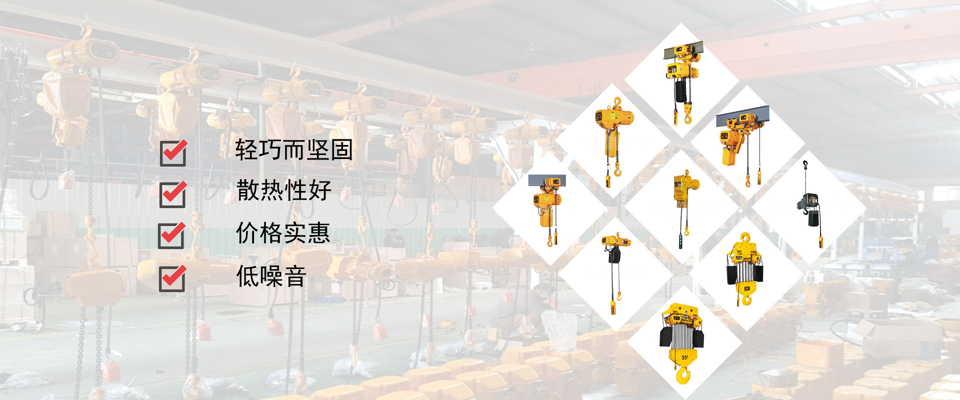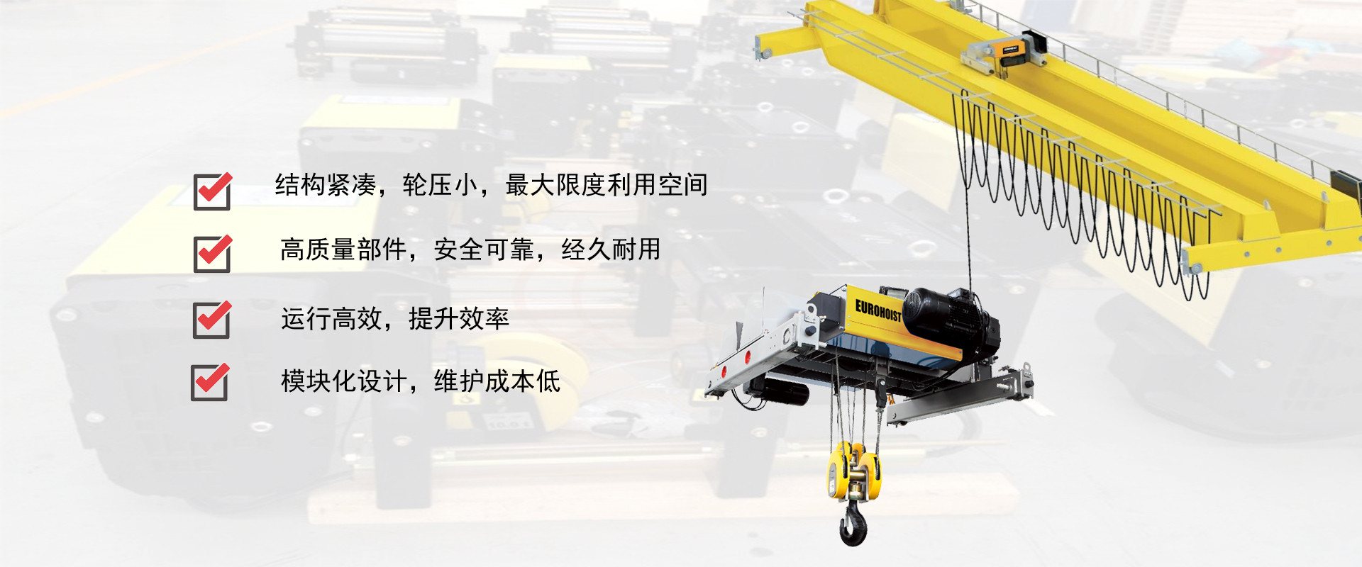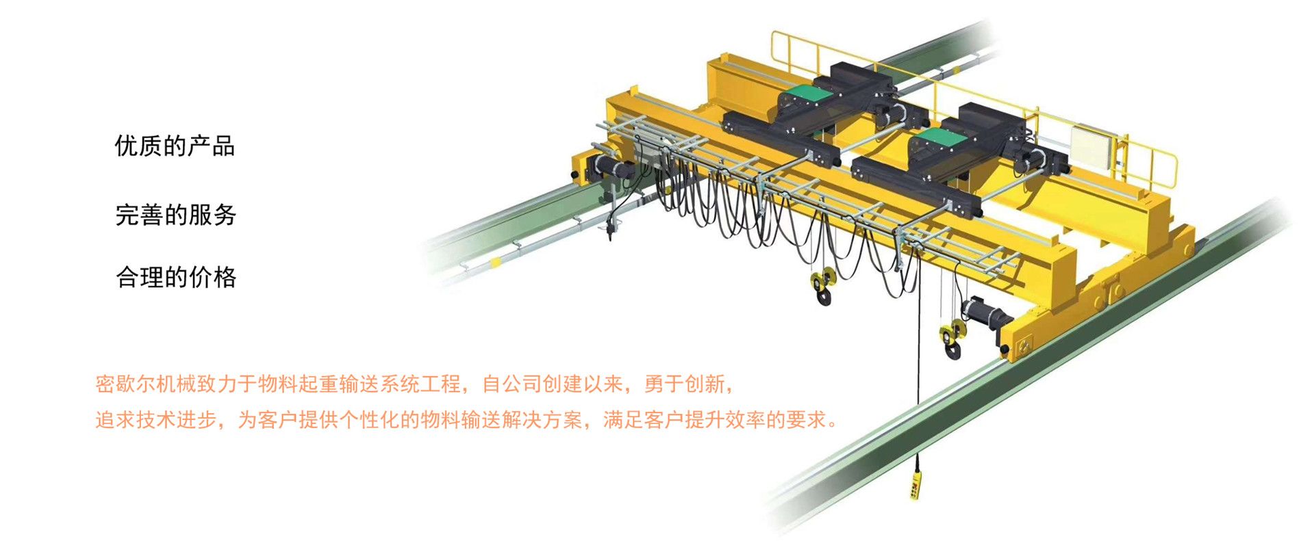 密歇爾起重機(jī)械(杭州)有限公司提供全面的起重輸送產(chǎn)品和服務(wù),產(chǎn)品覆蓋環(huán)鏈電動(dòng)葫蘆(125Kg-80T),歐式鋼絲繩葫蘆,防爆葫蘆,懸臂吊,KBK柔性起重機(jī),歐式起重機(jī),起重馬達(dá),端梁,起重移動(dòng)供電系統(tǒng)等,在國(guó)內(nèi)外被廣泛的應(yīng)用于生產(chǎn)車(chē)間,汽車(chē),模具,機(jī)械制造,鐵路,船舶,物流搬運(yùn),現(xiàn)代化工廠(chǎng)流水線(xiàn)等工業(yè)及其它特殊用途。